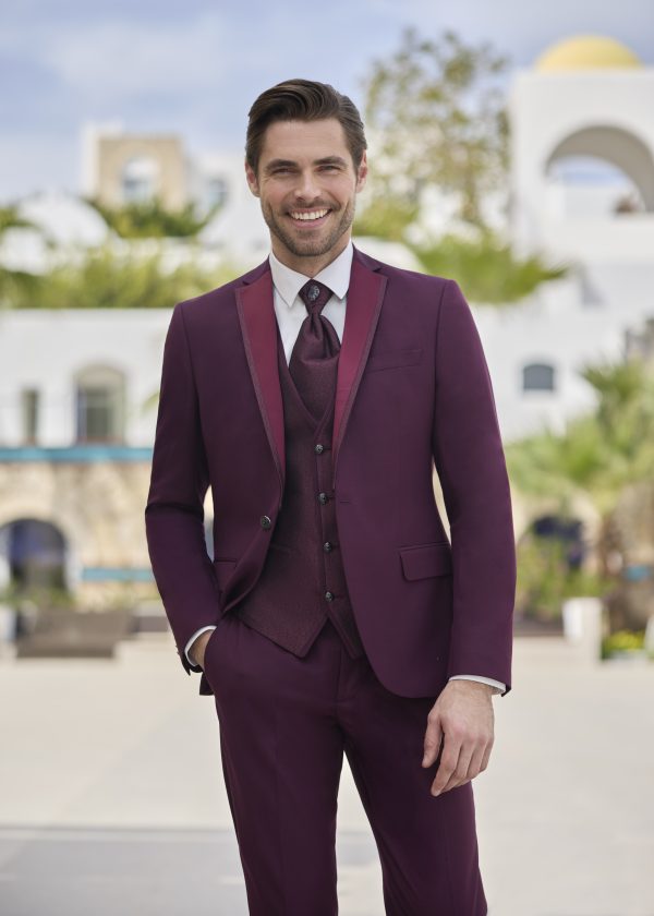 Si vous cherchez un costume bordeaux net, avec gilet et revers gansés, celui-ci correspond à ce que vous voyez ici.