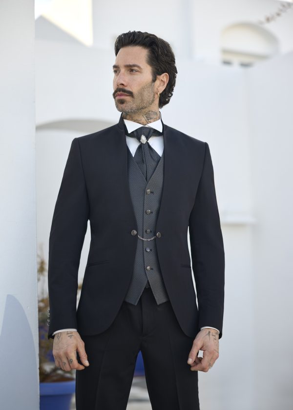 Vous avez ici un trois-pièces noir avec veste à col officier, sans revers. La ligne est près du corps, épaules nettes et longueur classique. Le tissu de la veste et du pantalon est noir, à l’aspect mat et régulier. On voit deux poches passepoilées droites et des poignets boutonnés. La fermeture est discrète, centrée, pour garder une façade épurée.