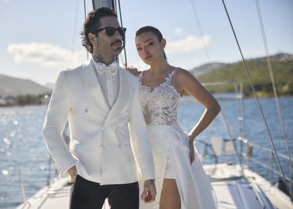 La chemise blanche et le nœud papillon ivoire aperçus sur la photo ne font pas partie du descriptif du costume, mais montrent bien la compatibilité du Brighton Ivoire avec des accessoires clairs et des pièces formelles noires.