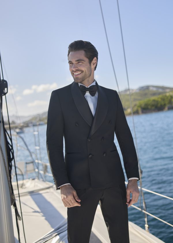 Le tissu montre un rendu lisse et mat sur le corps de la veste et du pantalon, avec des éléments satinés concentrés sur le col châle et le nœud papillon. L’ensemble donne un costume formel, sobre et précis dans ses détails, pensé pour une silhouette nette et actuelle.