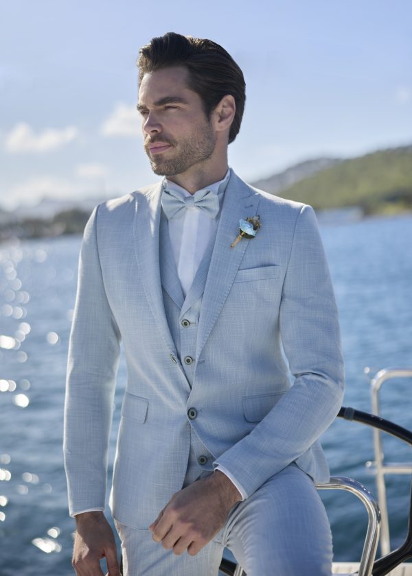 Le costume apparaît en bleu clair, avec un tissu à micro-motif quadrillé visible qui donne une texture régulière. La veste est à coupe ajustée, simple à l’avant, avec revers crantés de largeur moyenne. Fermeture frontale à deux boutons, poches latérales à rabat et poche poitrine passepoilée. Une boutonnière est fixée sur le revers gauche.
