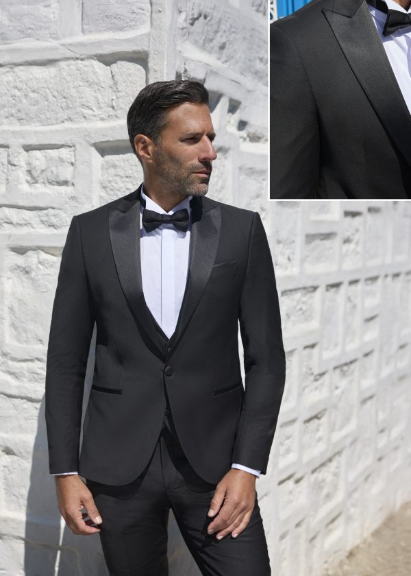 En résumé: costume noir à micro-motif, col châle en satin, fermeture à un bouton, gilet assorti inclus, coupe globale cintrée et contemporaine.